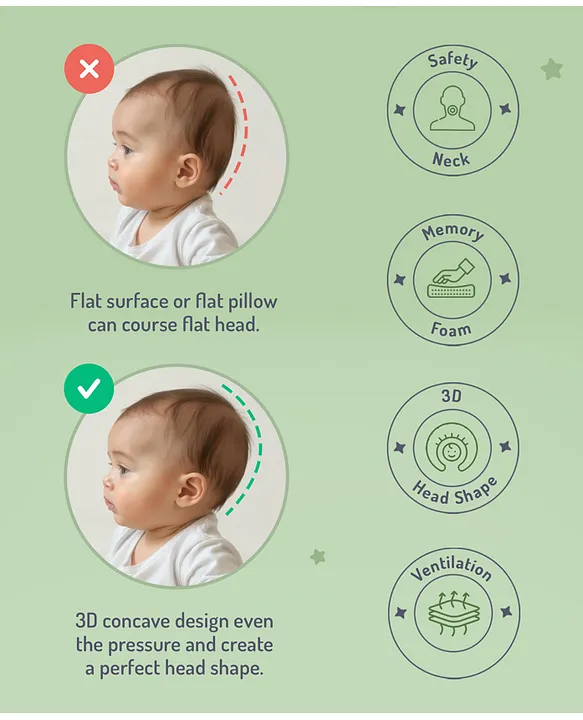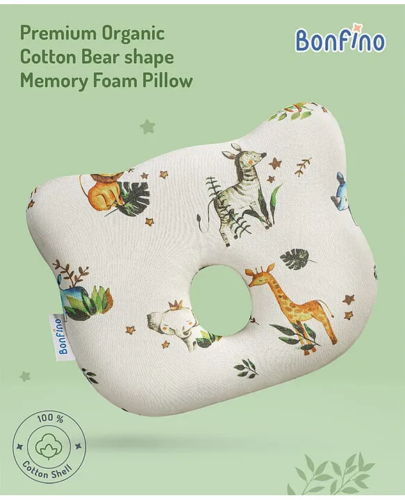 Bonfino Premium Cotton Bear shape Memory Foam Pillow African Safari Print- Green&White| Prevents Flat-Head Syndrome| Neck&Shoulder Support| Soft Breathable Fabric| Washable| Travel Friendly| 0+ Months