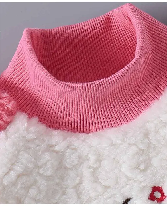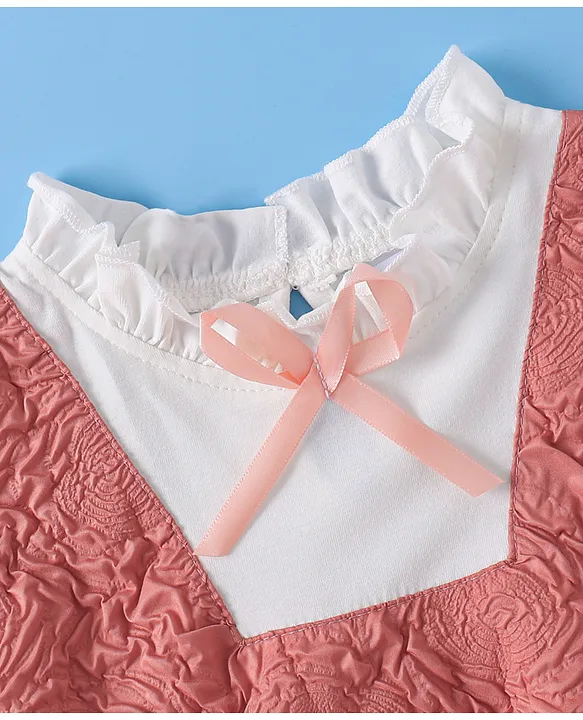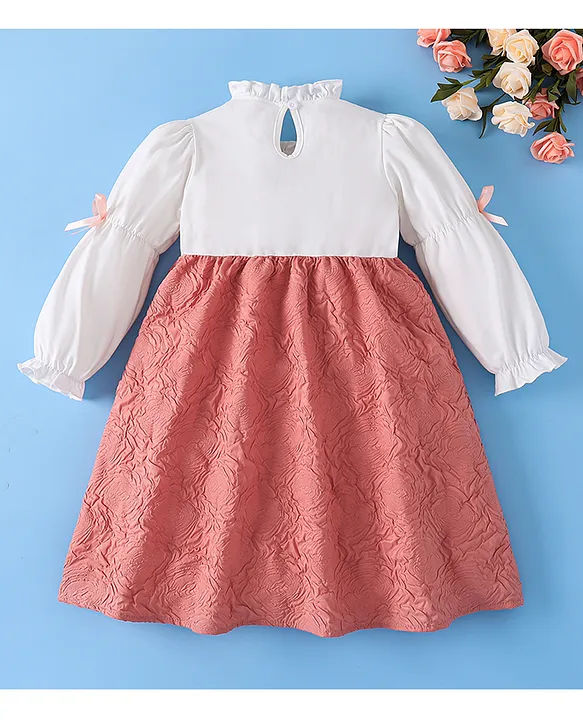 Mark & Mia Cotton Full Sleeves Winter Frock With Floral Embossed Textured With Bow Applique – Pink & White