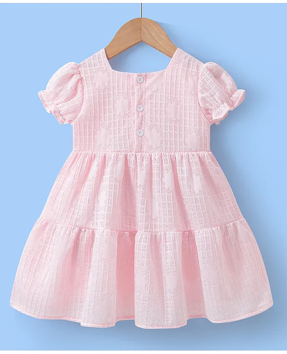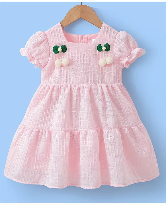 Mark & Mia Half Puffed Sleeves Pom Pom Applique & Textured Tiered Party Frock – Pink