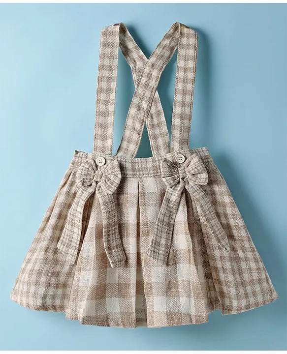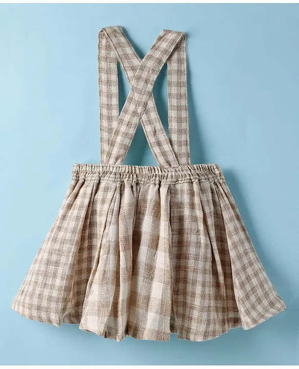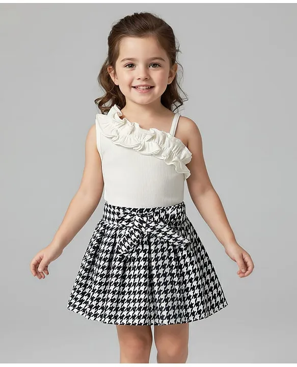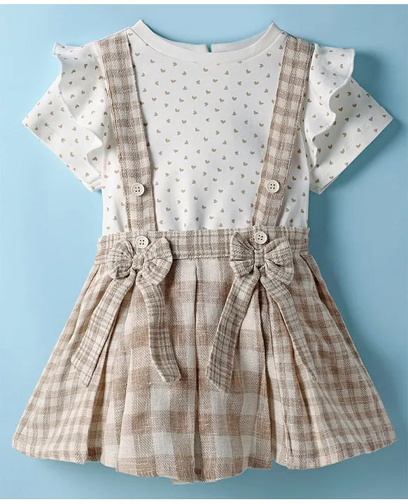 ToffyHouse Cotton Woven Half Sleeves Top & Skirt Set With Heart Print & Attached Suspender – White & Beige